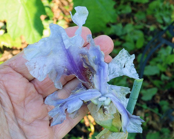 We’ve had a lot of rain here the last couple of months, historic levels in fact. Thankfully we’ve had no severe weather. But yesterday we had a thunderstorm that dumped 2 inches of rain in a short period of time, accompanied by half-inch sized hail. The hail did a number on things growing and blooming outside, including my wife’s beloved irises. They were looking quite lovely, and then BOOM came the thunder and hail.